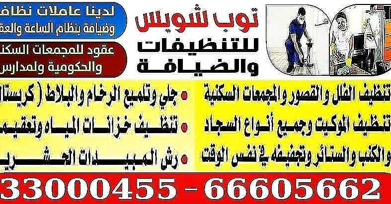 خدمات" توب شويس للتجارة والمقاولات والخدمات " نقدم خدمات التنظيف للفلل والمجمعات والشقق باحترافية عالية - خدمات غسيل السجاد والكنب والستائر - جلي وتلميع الرخام والبلاط وجميع اعمال التنظيفات/ -نقوم بتنظيف خزانات المياه -يوجد لدينا عاملات نظافه بالساعات، -يوجد لدينا رش مبيدات حشرية تواصل معنا /66605662/33000455