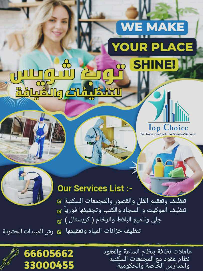 خدمات" توب شويس للتجارة والمقاولات والخدمات " نقدم خدمات التنظيف للفلل والمجمعات والشقق باحترافية عالية - خدمات غسيل السجاد والكنب والستائر - جلي وتلميع الرخام والبلاط وجميع اعمال التنظيفات/ -نقوم بتنظيف خزانات المياه -يوجد لدينا عاملات نظافه بالساعات، -يوجد لدينا رش مبيدات حشرية تواصل معنا /66605662/33000455