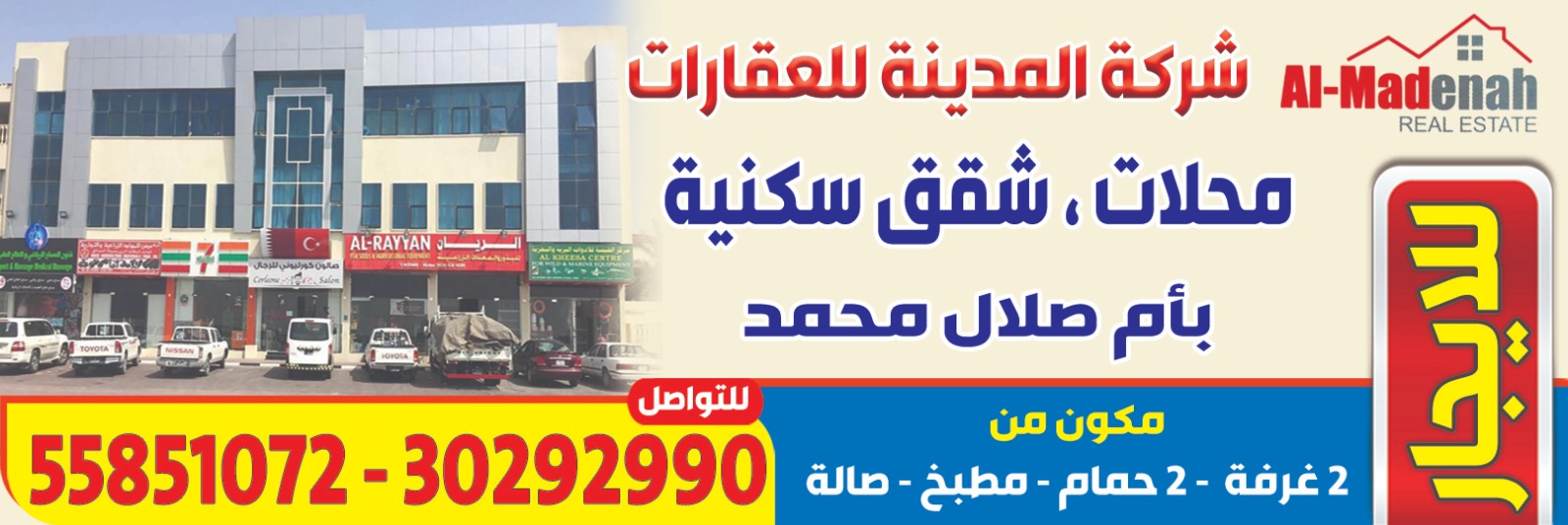 شركة المدينة للعقارات للإيجار شقة سكنية ببناية ام صلال 2 مكونه من : 2 غرف نوم كبيره ، ، صاله كبيرة جدا 4*8 ، 2 حمام ، مطبخ . مطلوب : 5000 ريال للتواصل : 55851072 //30292990
