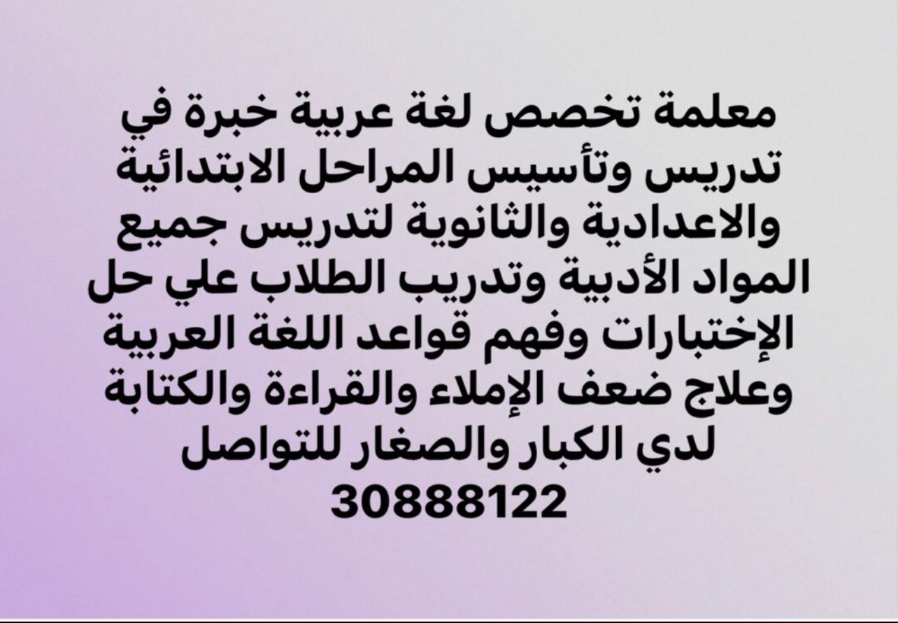 خدماتمعلمة تخصص لغة عربية خبرة في تدريس وتأسيس المراحل الابتدائية والاعدادية والثانوية لتدريس جميع المواد الأدبية وتدريب الطلاب علي حل الإختبارات وفهم قواعد اللغة العربية وعلاج ضعف الإملاء والقراءة والكتابة لدي الكبار والصغار للتواصل 30888122